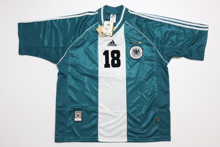 1998 Germany National team away jersey. Klinsmann’s name and his number 18 are on the jersey. Made in England, Adidas official licensed jersey.